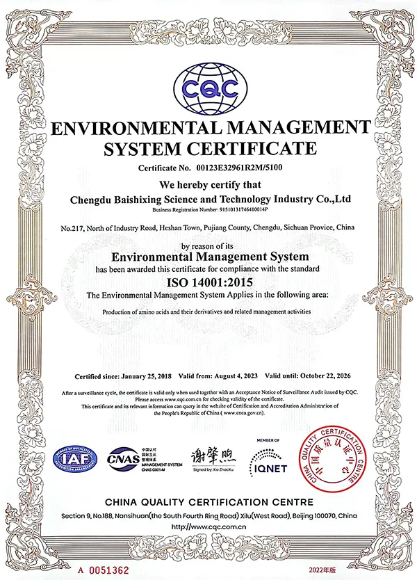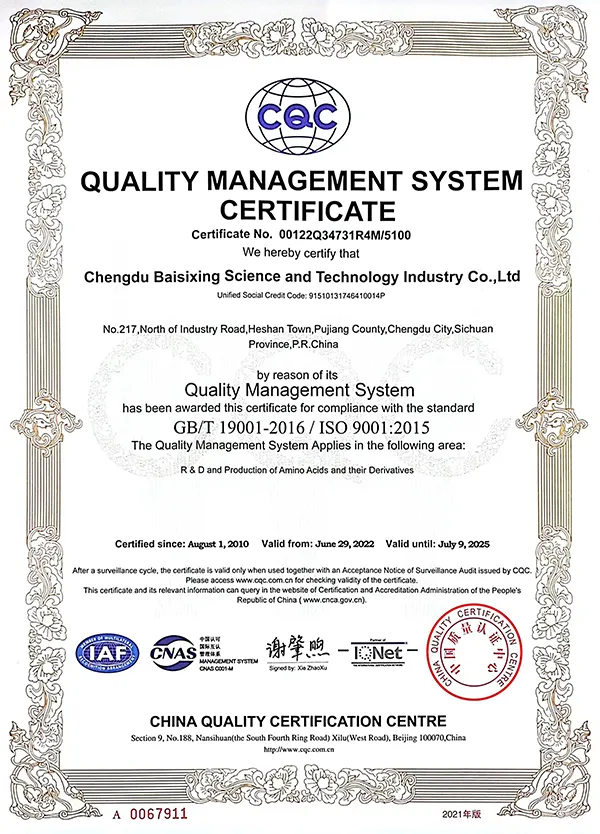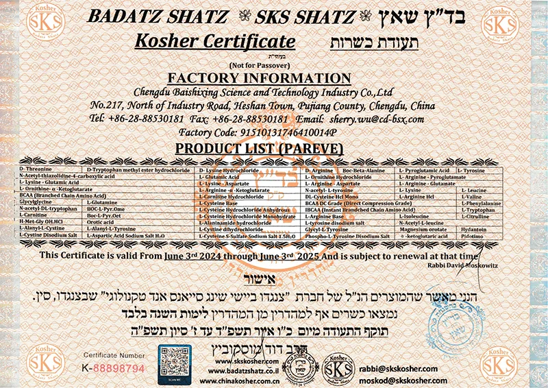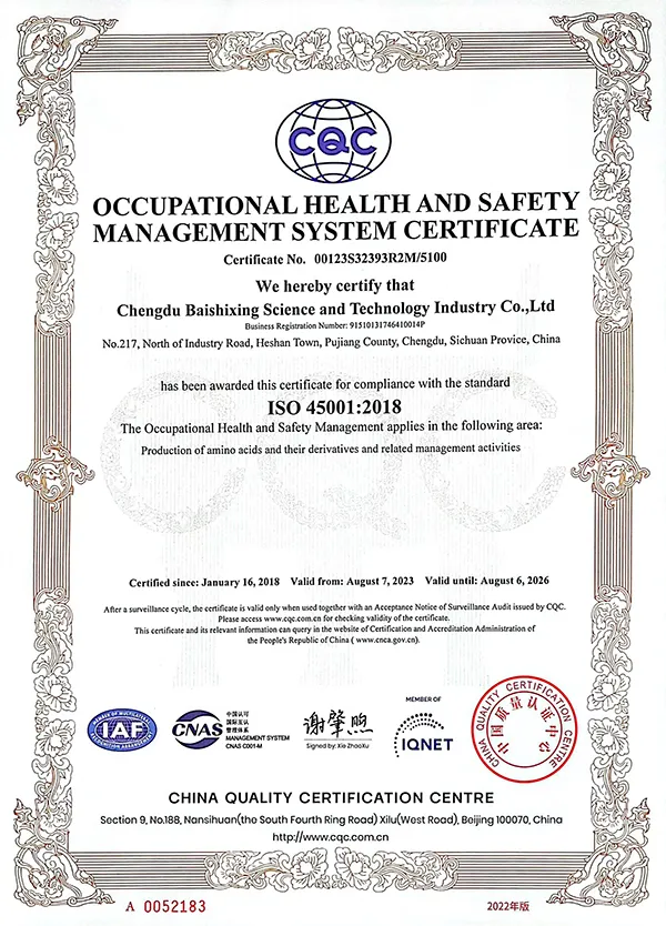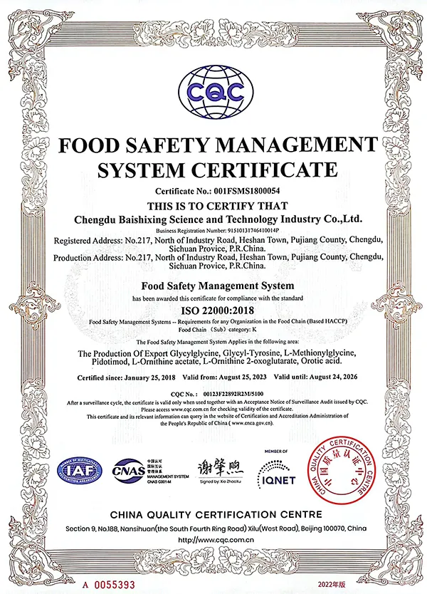 Bei Baishixing legen wir großen Wert auf Qualität in jeder Produktionsphase. Unsere Einrichtungen sind mit modernen Analysegeräten ausgestattet, darunter Gas- und Flüssigkeitschromatographiesysteme, die eine präzise und zuverlässige Prüfung gewährleisten. Wir sind nach mehreren internationalen Standards zertifiziert, darunter ISO 9001 für Qualitätsmanagement, ISO 14001 für Umweltmanagement, ISO 22000 für Lebensmittelsicherheit, ISO 45001 für Arbeits- und Gesundheitsschutz sowie Kosher-Zertifizierung.